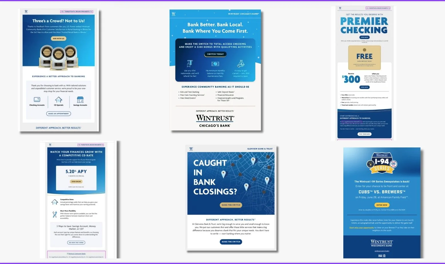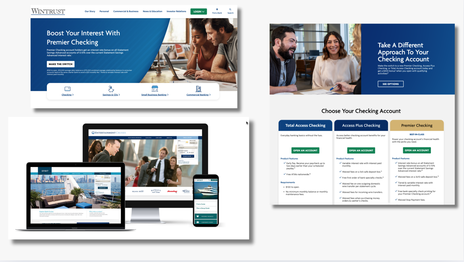 To support the full brand overhaul at Wintrust, I built a fully functioning in-house creative agency. This gave us the ability to move faster, stay on-brand, and dramatically improve performance—cutting cost-per-acquisition by 40% and increasing online account openings by 50%.