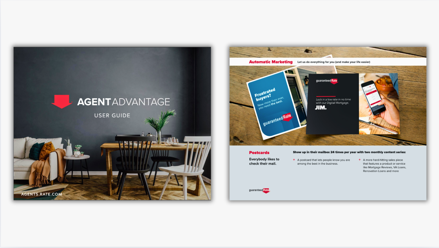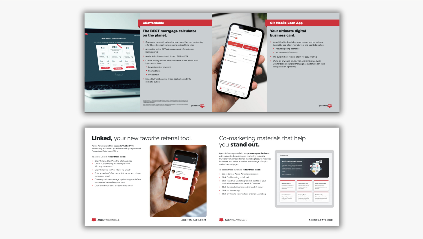 As Creative Director, I developed both the Agent Advantage User Guide and Guaranteed Rate’s Full Digital Platform Guide to drive growth and adoption of GR’s proprietary SaaS tools. These multi-channel sales assets clearly communicated the value of our digital ecosystem to two key audiences: real estate partners and prospective loan officers. From lead-sharing systems and affordability calculators to automated postcard marketing and mobile apps, the content simplified complex tech into compelling, visually engaging narratives. These guides empowered sales teams, deepened referral relationships, and helped scale the business nationwide.